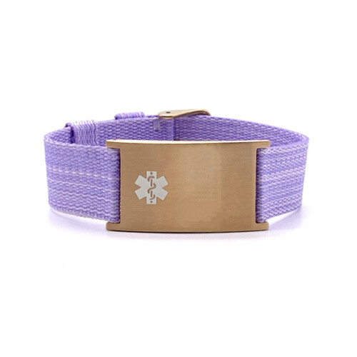 Pulsera lavanda de nailon ajustable con placa plateada y símbolo rojo. Un brazalete de identificación médica habla por usted en una emergencia cuando usted no puede, lo que permite a los socorristas evaluar adecuadamente la situación y cómo tratarlo adecuadamente.