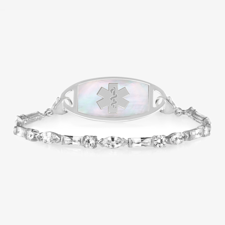 Madreperla blanca color Plata Puede usar estas pulseras de identificación de cristales médicos de oro intercambiables para mujer solas o en combinación con otras pulseras o brazaletes para una apariencia moderna y apilada.