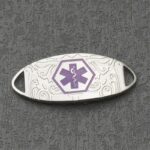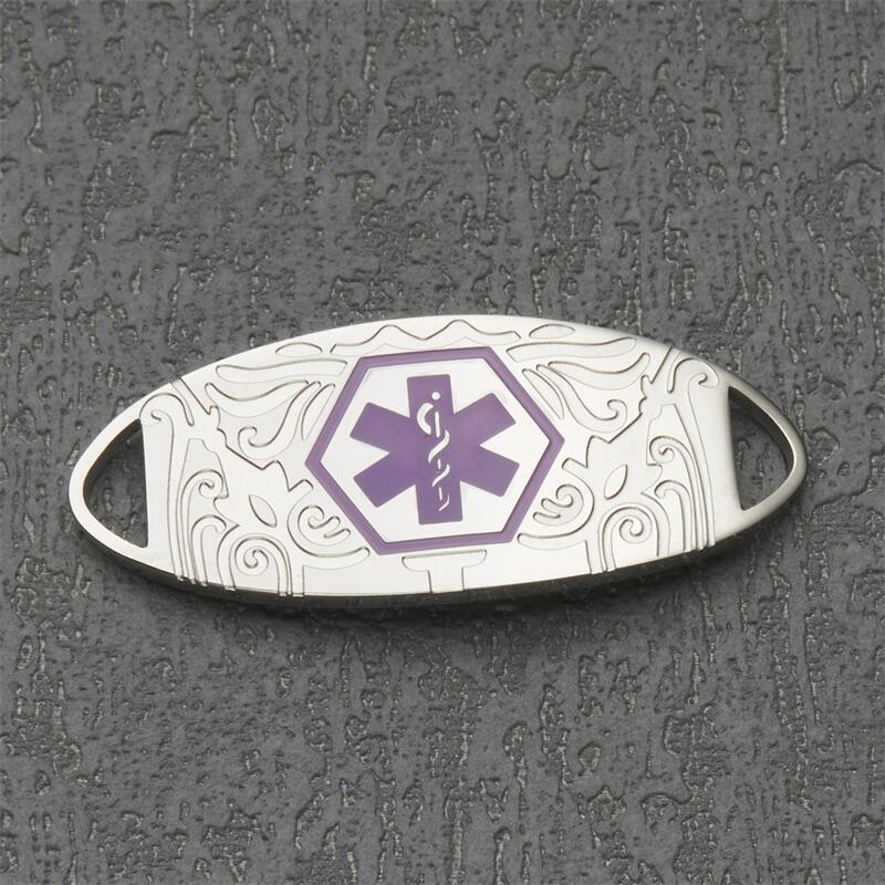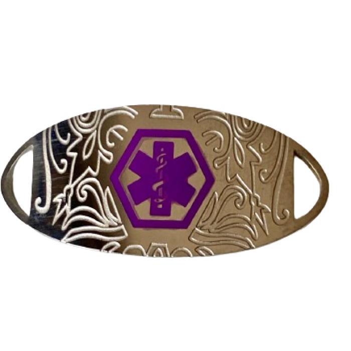 Chapa acero plateado diseño tribal blanco/ morada Vendido por separado. visite paginas de tiras de pulseras. Esta medalla tiene disponible su grabado MiRPRE único solo en la parte trasera. Totalmente personalizable para combinar con todas las tiras de pulseras intercambiables.Símbolo de caduceo médico en morado