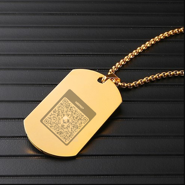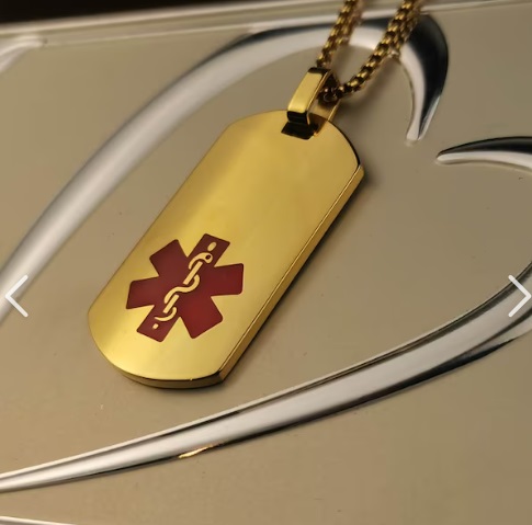 La parte delantera o trasera de esta medalla de identificación médica dorada contiene un código MIRPRE® o un texto accesible. Disponible para cadenas intercambiables, medalla con símbolo de caduceo médico en rojo.
