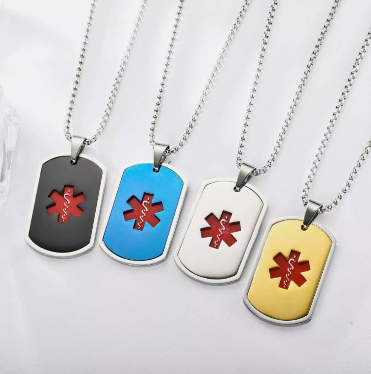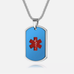 El código MIRPRE® y el texto disponible se encuentran en la parte trasera de esta medalla Estrella de Vida color azul metálico. Disponible para cadenas intercambiables, medalla con símbolo de caduceo médico en rojo. Material de medalla y cadena: acero inoxidable quirúrgico hipoalergénico de alta calidad. Excelente resistencia a la corrosión y duración.