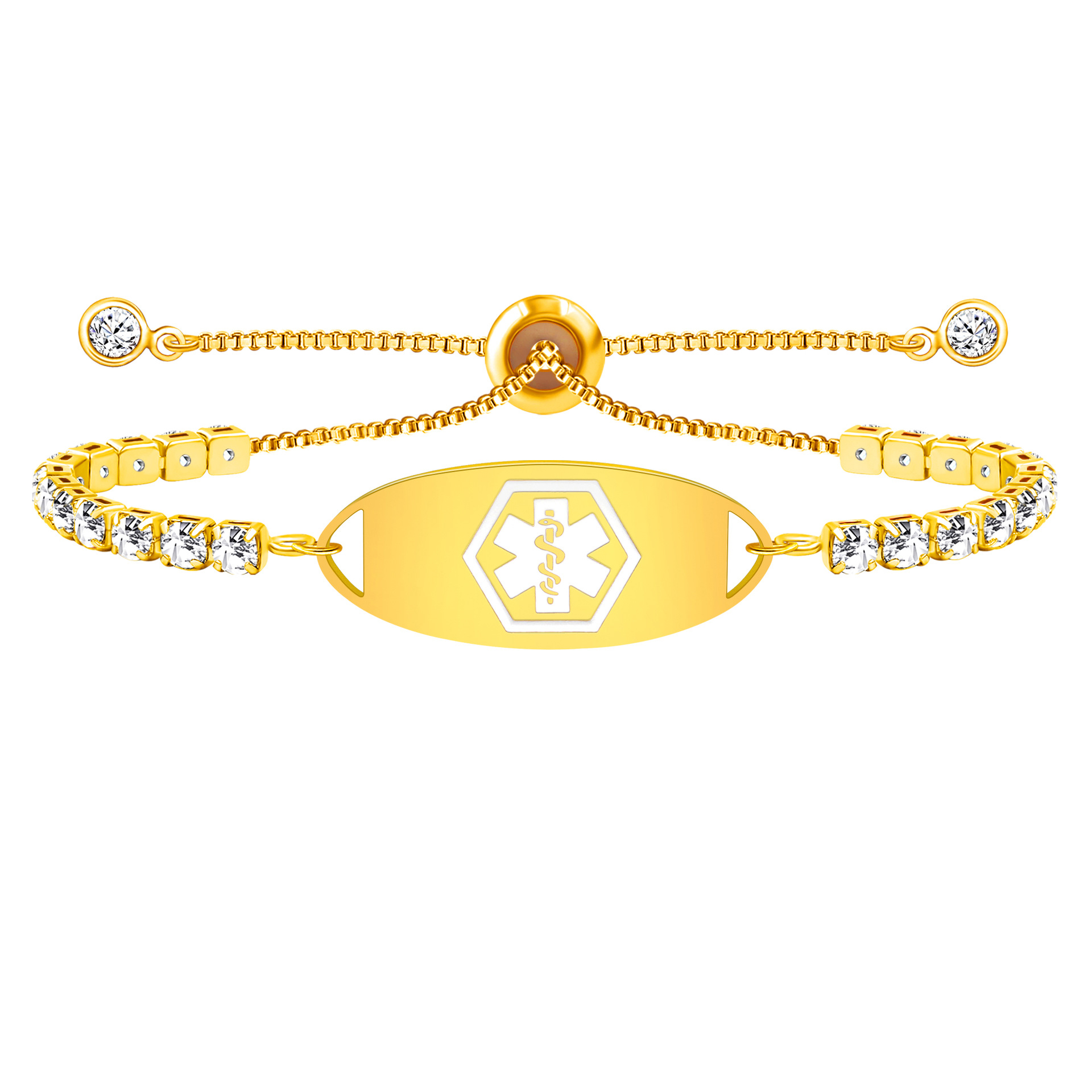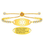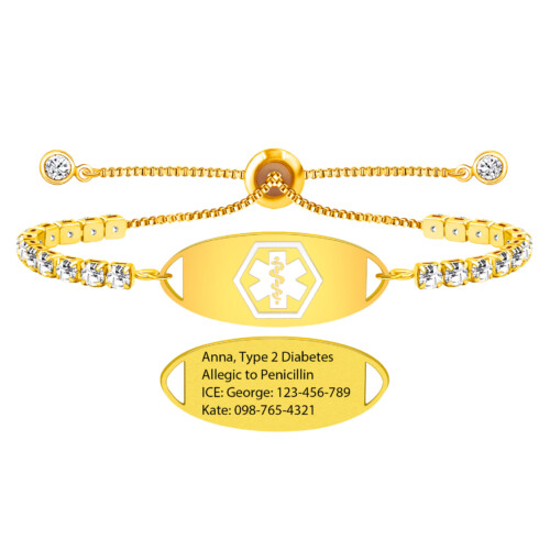 Pulsera bling bling DORADA. Acero inoxidable + latón + circón. Grabe/médico con láser/información de contacto en la parte posterior. Puedes usar estas pulseras de alerta médica ajustables de zirconia bling bling para mujer solas o en combinación con otras pulseras para un look moderno y a la moda. Cuando se trata de encontrar una identificación cómoda que se adapte a su estilo de vida activo, no debería tener que pasar por estas pulseras de alerta médica ajustables con circonitas para mujer de Bling Bling.