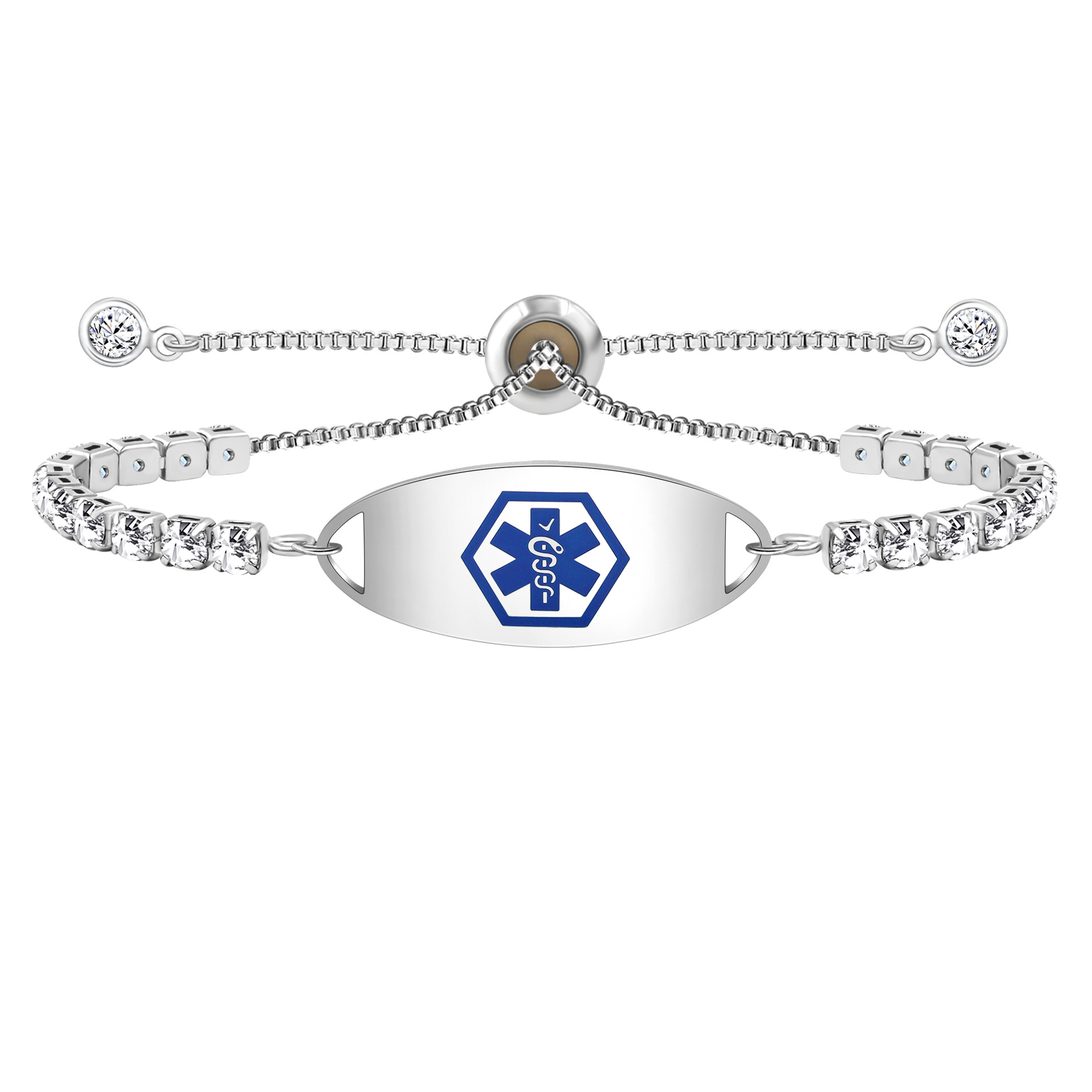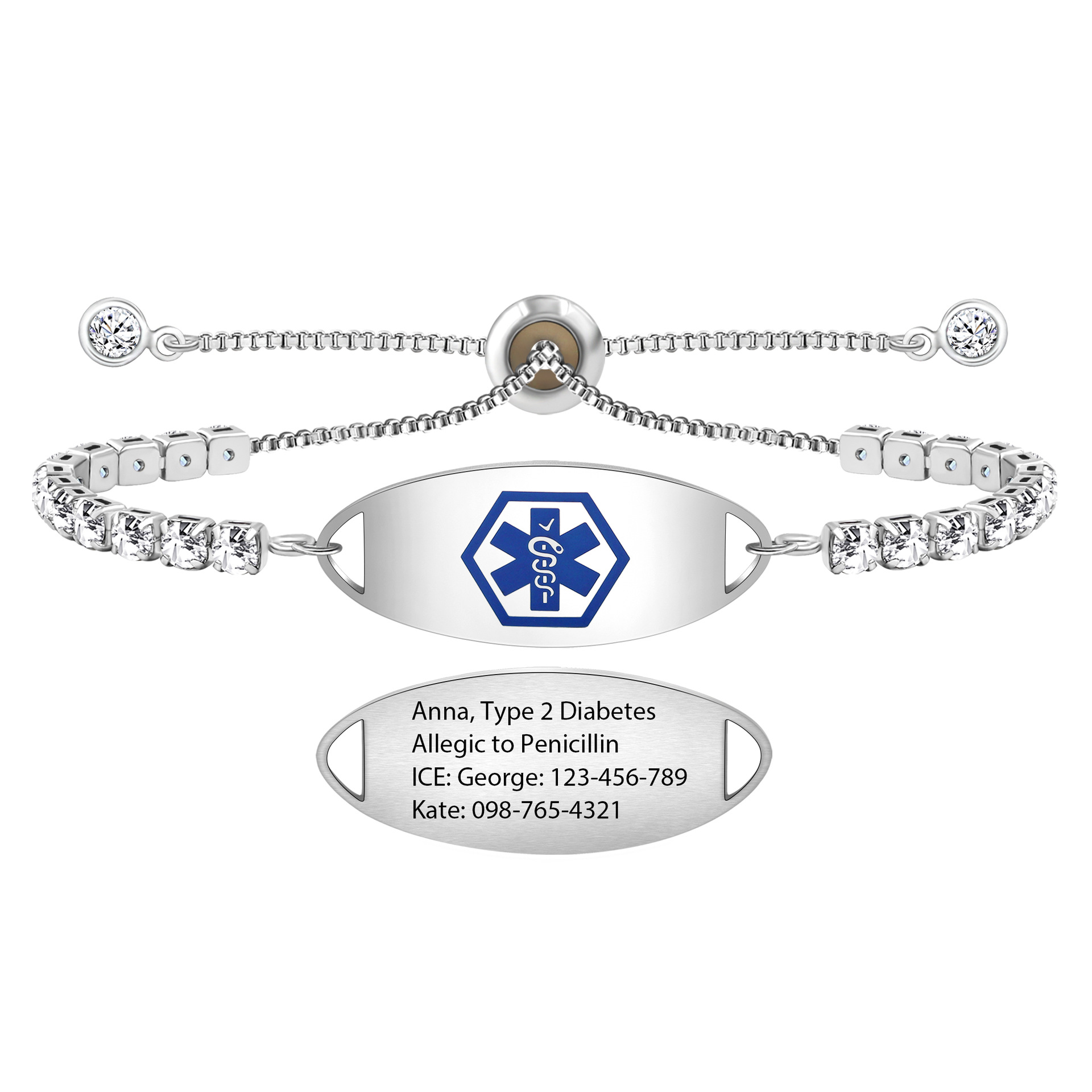 Grabe/médico con láser/información de contacto en la parte posterior. Puedes usar estas pulseras de alerta médica ajustables de zirconia bling bling para mujer solas o en combinación con otras pulseras para un look moderno y a la moda.