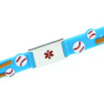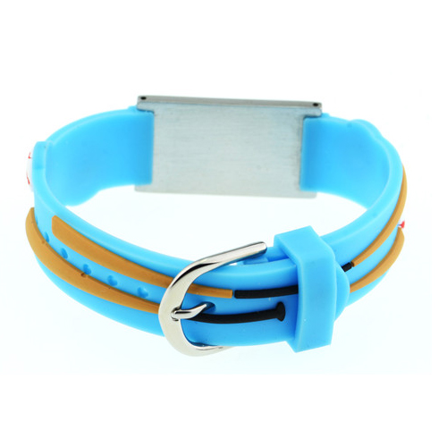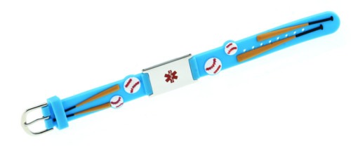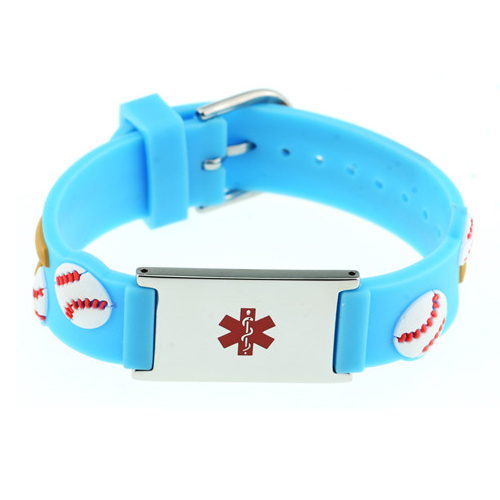 Pulsera de silicona Béisbol azul claro para niños, etiqueta plateada con símbolo rojo