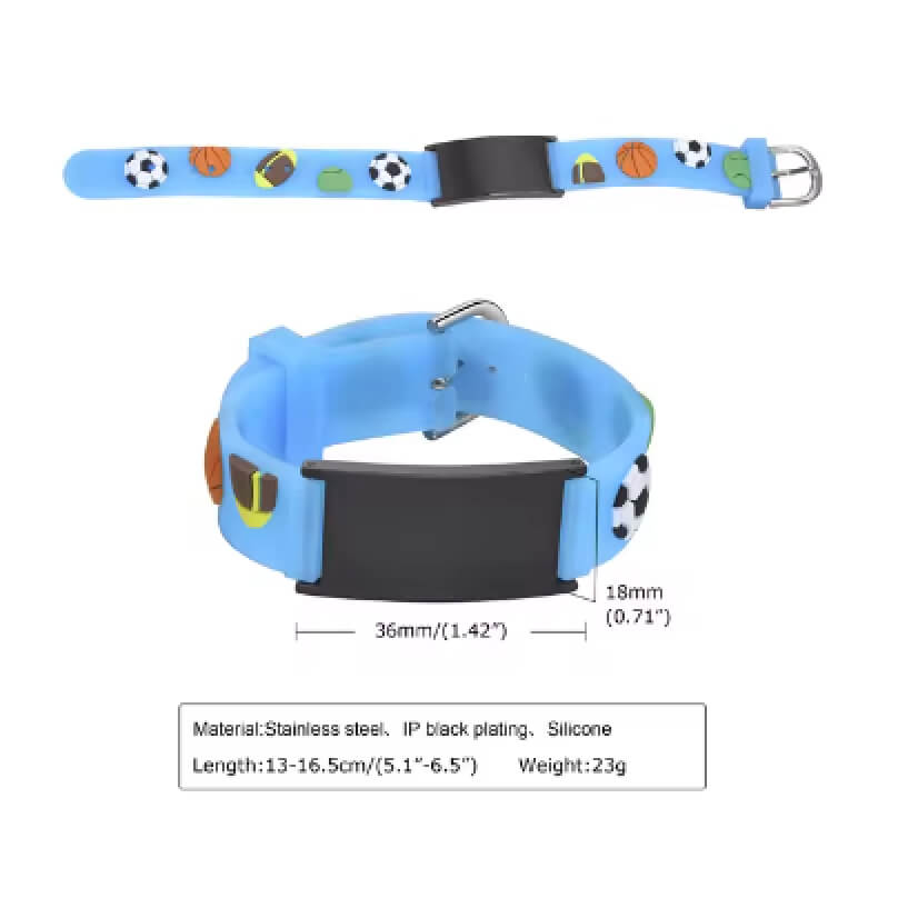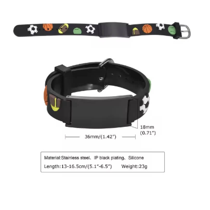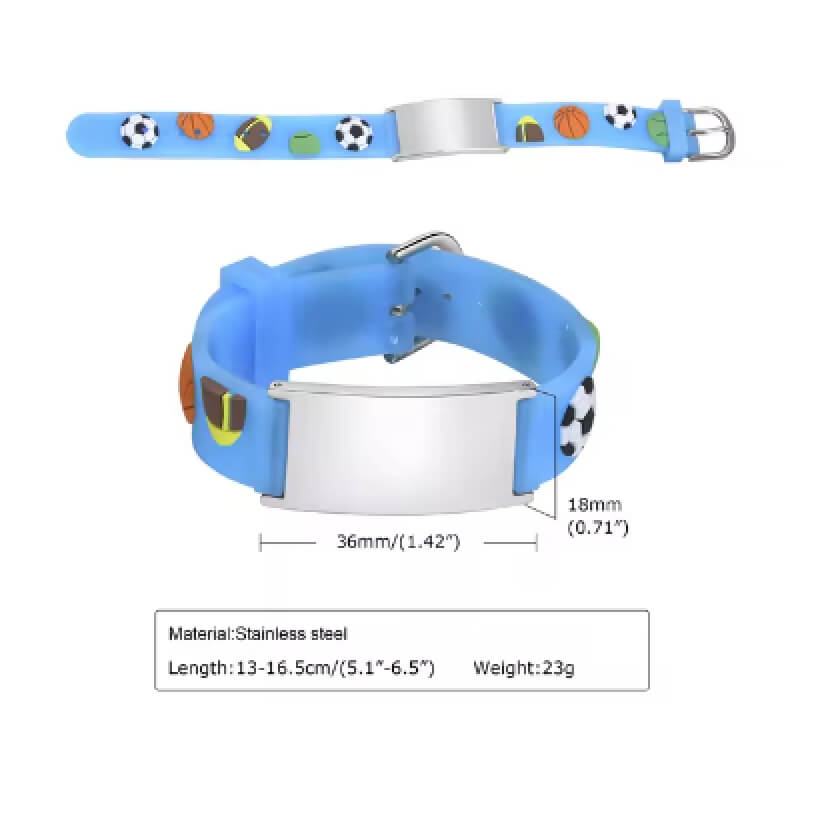 Pulsera de silicona para niño/niños BALÓN DE FÚTBOL. ¡Una pulsera que tu hijo querrá usar! Esta pulsera presenta: Banda ajustable de PVC sin látex de 1/2″ de ancho con fácil ajuste. Se adapta a tamaños de muñeca de 5 a 6 1/2 pulgadas. Sin níquel, sin plomo y sin látex. Placa médica de acero inoxidable con rojo Símbolo médico.